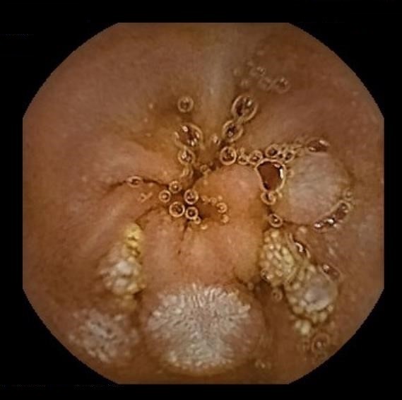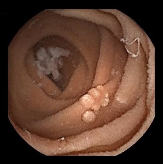A 79-year-old male, with a past medical history of hypertension, dyslipidemia and type 2 diabetes, underwent a routine esophagogastroduodenoscopy. He was asymptomatic, with unremarkable blood tests. The endoscopy showed multiple whitish nodular lesions on the posterior and upper wall of the bulb. The patient also performed a capsule enteroscopy, which revealed several polypoid lesions with a whitish appearance scattered throughout the small bowel. Histopathologic examination was compatible with duodenal-type follicular lymphoma (grade 1). A “watch and wait” strategy was chosen. Esophagogastroduodenoscopy and capsule endoscopy reevaluation, performed 6 years after the initial diagnosis, showed stable disease with overlapping findings.