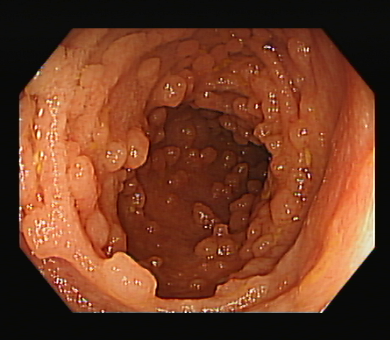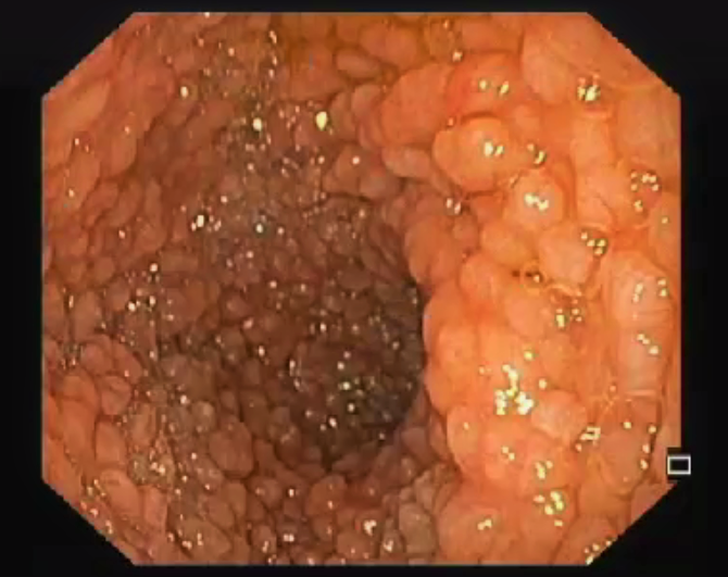 A 39-year-old woman, without relevant past medical history, underwent endoscopic studies due to iron deficiency anemia. Esophagogastroduodenoscopy showed a duodenal mucosa with multiple nodular lesions. Colonoscopy revealed multiple nodular-like lesions in the terminal ileum. The capsule endoscopy showed that the entire intestinal mucosa (duodenum, jejunum and ileum) also had a diffuse nodular appearance. The anatomopathological examination was compatible with nodular lymphoid hyperplasia, without aspects suggestive of lymphoproliferative disease. Later, the patient was diagnosed with common variable immunodeficiency and started replacement therapy with immunoglobulin G.