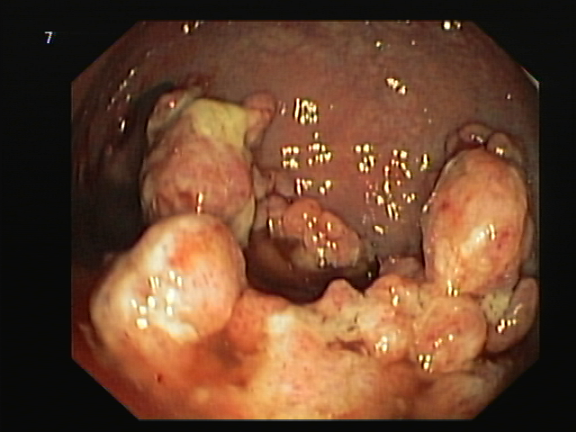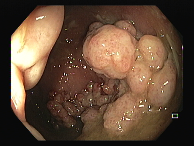 A 17-year-old male with no previous medical history presented with rectal bleeding, mucus discharge and rectal prolapse. Colonoscopy revealed several polypoidal growth masses in the distal rectum, formed by multiple sessile polyps with glistening mucus-covered surface and fleshy, friable appearance that coalesced forming large conglomerates. Given their complexity and large size, piecemeal endoscopic mucosal resection was performed and histopathological examination revealed ulcerated polypoid mucosa with mixed inflammatory cell infiltrate and dilated cystic mucus-filled glands. Remarkably, bony trabeculae surrounded by osteoblastic cells were also seen. These findings were consistent with juvenile polyps with foci of osseous metaplasia, an exceedingly rare finding.